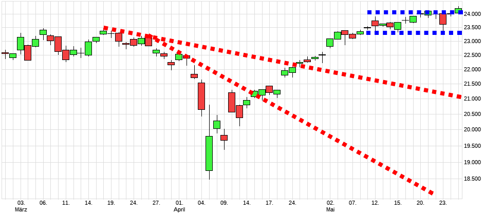 gleich dynamisch darüber springen ist natürlich schwierig. Positiv ist, das Gap bei 22600 wurde nicht geschlossen. Wenn er oben raus will müssen alle erst wieder verunsichert werden. Der DAX dreht völlig durch, DOW hat nicht mal die Hälfte aufgeholt und Dax steht bereits vor neuen Hochs. Wenn der DOW seine Hochs ereicht ist der Dax dann bei 30000 ?