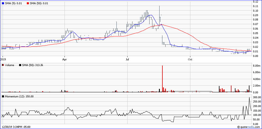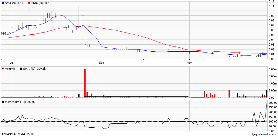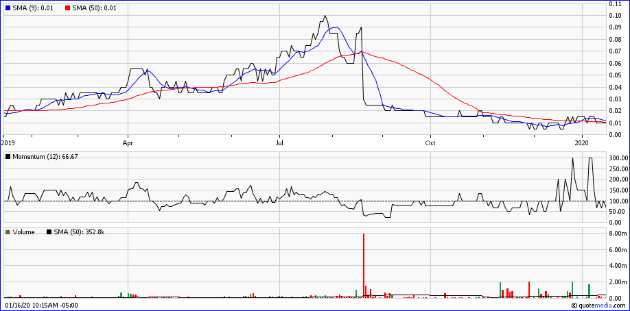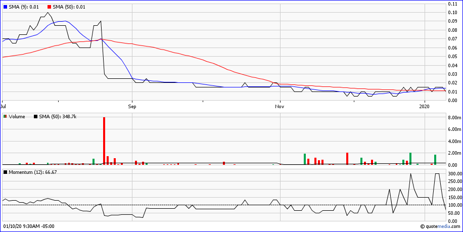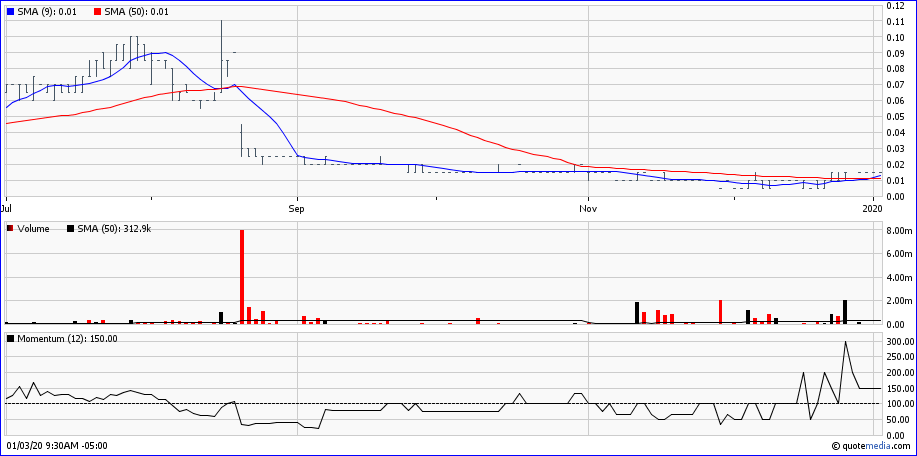 ... hier ersichtlich im Jahres-Chart vom Freitag (2020-JAN-10), sollte uns nicht davon ablenken, auch weiterhin auf das Momentum zu achten ! - Dieses sollte nicht gar zu stark nach oben ausfransen, auch wenn der in Stuttgart transagierte Curs von 0,013 € nicht sonderlich stark über dem derzeit umkämpften Curse von 0,015 $ in Canada liegt ...