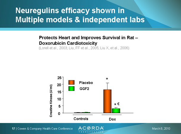 Aufgrund der Fortschritte von Acorda bei der Entwicklung von GGF2 (von PAION UK, vormals CeNeS in 2002 an Acorda auslizenziert) wird nun für 2010 der Start der ersten klinischen Studie erwartet. Mit dem Übergang von der präklinischen in die klinische Phase werden erste Meilensteinzahlungen fällig. Bei erfolgreicher Entwicklung sind bis zur Zulassung insgesamt USD 8,5 Mio. Meilensteinzahlungen und anschließend umsatzabhängige Lizenzgebühren an PAION zu zahlen.