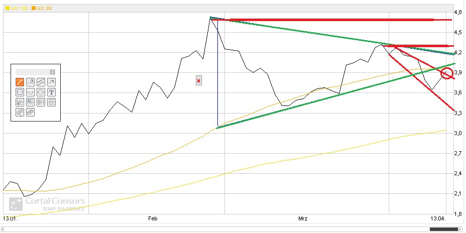 Viel deutlicher ist allerdings das zulaufende Dreieck, grün dargestellt. Dies deutet auf einen Ausbruch nach oben hin. Bricht der Kurs nach oben aus, ist ein Anstieg im Bereich x zu erwarten (blaue Linie), nachdem die beiden Widerstände bei ca. 4,27$ und 4,75$ durchbrochen sind.