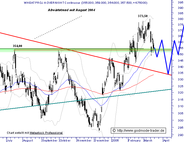 Der Future auf Weizen (Wheat) im adjustierten Endloskontrakt konnte im Zuge der Aufwärtsbewegung die Abwärtstrendlinie seit August 2004 nach oben aufhebeln und im Anschluss daran den wichtigen horizontalen Widerstand bei 354,00 US-Cent/bushel überwinden. Die Konsequenz daraus war ein neues Bewegungshoch bei 373,50 US-Cent/bushel. Seitdem zeigt sich eine scharfe Abwärtsbewegung, die sich charttechnisch als obligatorische Pullbackbewegung eingliedern läßt. Die Korrekturphase erreicht zwar die wichtige Unterstützung bei 354,00 US-Cent/bushel, sieht aber noch nicht "fertig" aus. Eine Fortsetzung der Abwärtsbewegung wäre also weiterhin möglich und könnte durchaus noch den Bereich des Abwärtstrends seit August 2004 bei 335,00 US-Cent/bushel erreichen.