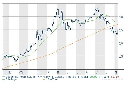 Die Erholung setzt ein, nachdem die Aktie deutlich unter die 38- bzw. 200-Tage-Linie gefallen ist. Solon ist eine der am günstigsten bewerteten Solar-Aktien mit ähnlich starker Performance wie Solorworld. Die Rohmaterialbeschaffung wurde erst kürzlich bis 2007 vertraglich sichergestellt. Neben dem organischen Wachstum biette der "SOLON-Mover" weitere Fantasie: Die Solarzellen richten sich automatisch nach der Sonneneinstrahlung aus, um die Energiebilanz zu maximieren !