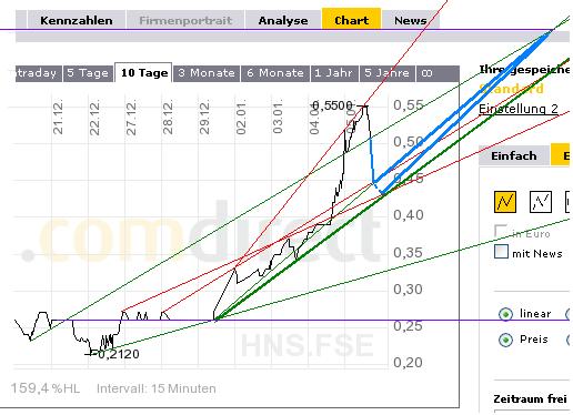 Nach 10 Tages FSE-Chart ist dann ein Anstieg auf 0,70 Euro oder leicht darüber (Hier verläuft auch in etwa die 200 Tage Linie!)nicht auszuschließen! Das würde in USA in etwa 1 $ entsprechen.