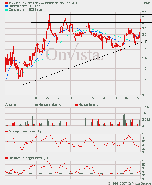 Hab mal, da noch net aktuell, das Chandle und die Umsätze von dieser Woche eingezeichnet. Echt beeindruckend! Ein absoluter Ausbruch, vorallem auch durch den SK über 2,40. Im Linienchart sind die 2,50 voll wichtig, da sie ein harter Widerstand auf Wochen-SK-Basis sind. Diese Marke wird wohl auch die ganze nächste Woche umkämpft sein und gegen WE hoffentlich nachhaltig übersprungen sein. Die 2,70 sind dann ansich nur noch ne Kleinigkeit da nicht besonders markant.
