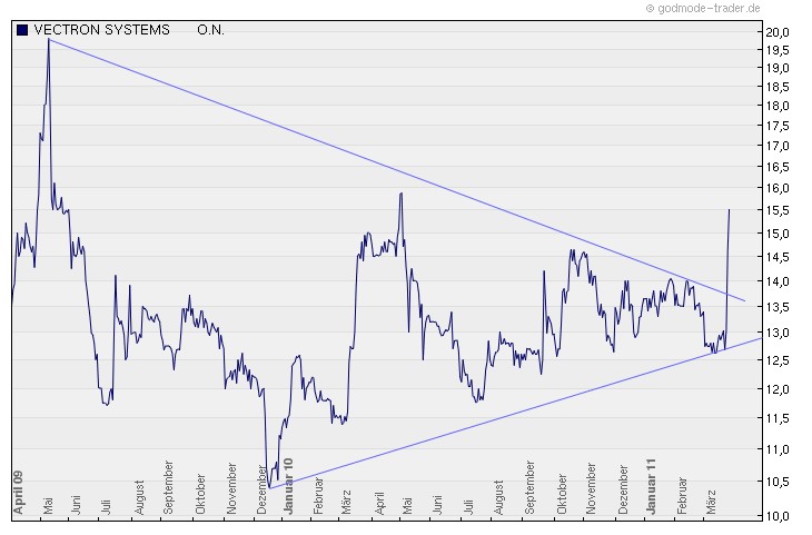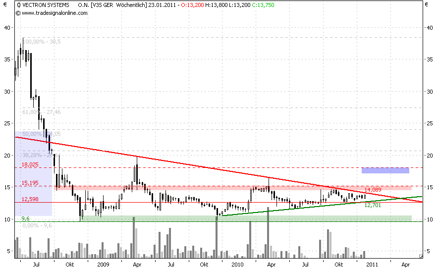 sehr kurzfristig hat Vectron Systems eine Präsentation vor Analysten und Investoren in Frankfurt abgesagt. Dabei könnte das Papier des Anbieters von Kassensystemen zu einem der Geheimtipps für 2012 werden. Das vergangene Jahr lief alles andere als rund für die Münsteraner. Die Einführung neuer Produkte sowie die Etablierung des Kundenbindungssystems Bonvito kamen viel später in Gang als gedacht. Darin liegt auch die Chance des Nebenwerts, denn der Nachrichtenfluss kann im laufenden Jahr eigentlich nur besser werden. Zudem ist die Hälfte des Kurses durch Cash abgesichert, Bankverbindlichkeiten gibt es keine. Für die Analysten hat der Titel derzeit durchaus das Zeug zu einem Kursverdoppler. Mutige Anleger legen sich daher schon jetzt ein paar Papiere ins Depot. Auch wenn der Chart noch kein Kaufsignal liefert."