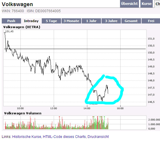 INteressant ist in diesem Zusammenhang die Beobachtung, dass der VW-Kurs oft gegen Handelsende deutlich nach oben gezogen wird. Oft gegen den Trend. Das war das typische Vorgehen der WestLB im zurückliegenden Fall von Kursmanipulationen bei den VW-Vorzugsaktien.
