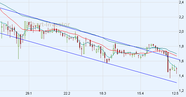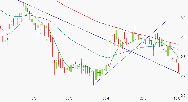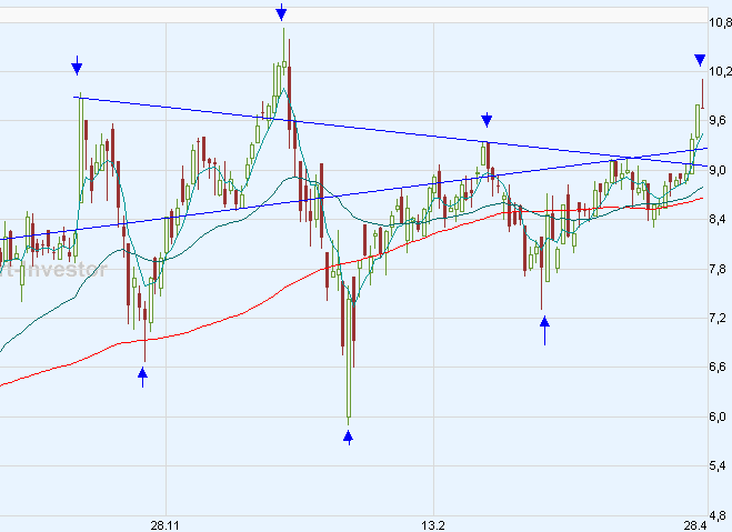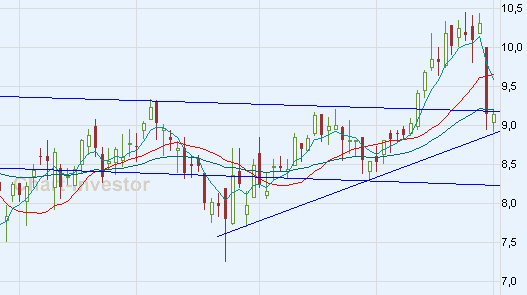 mit einem Doppeltop ist die 2 Monate dauernde Aufwärtsbewegung beendet. Die Frage ist nun, welcher Trend sich durchsetzen wird. --------------------------------------- |