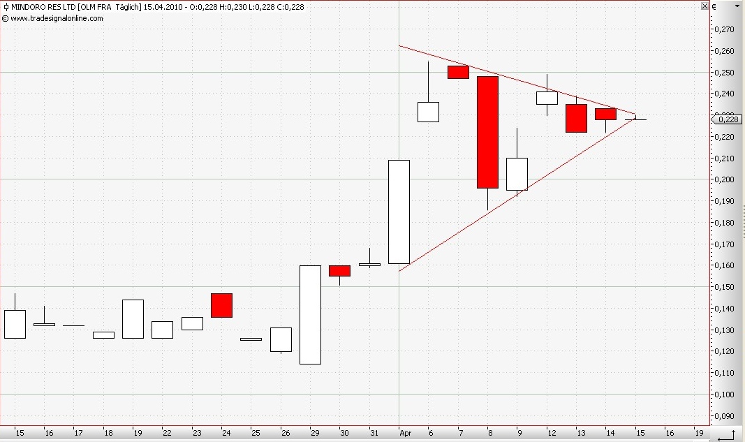 Konsolidierung bis zu einem leicht bullischen Doji ohne unteren Fuß, der letzte Kurs war auch der tiefste tiefe Kurs, nur nach oben wurde ein kleiner Anlauf gestartet, der aber auch ohne Erfolg blieb. In der Spitze des Dreieckes wird immer etwas entschieden. Fragt sich was?