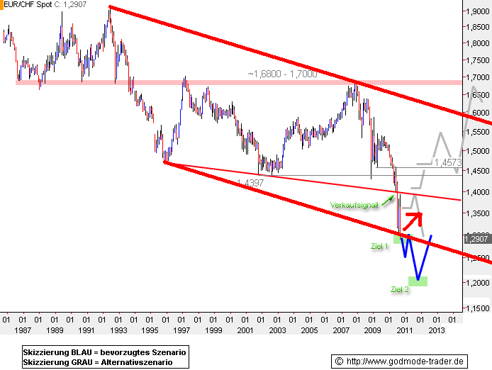 Rückblick: Der Euro gerät gegenüber dem Schweizer Ende weiter unter Druck, der August war mit einem Wertverlust von 7,3 % ein rabenschwarzer Monat für den Kursverlauf von EUR/CHF. Die bereits im Mai dieses Jahres geäußerten Bedenken hinsichtlich eines drohenden Kursrutsches des Euros haben sich bestätigt, das erste der genannten Ziele bei 1,2800 - 1,3000 CHF ist nun erreicht (bitte hier klicken, um zur Ausgangsanalyse zu gelangen).