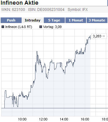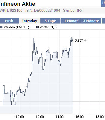 dass infineon heute gestigen ist, wohl aufgrund eines gerüchtes, ein bischen normale schwankung - diesmal nach oben, .... ja, stimmt. aber das ist ja nichts besonderes.