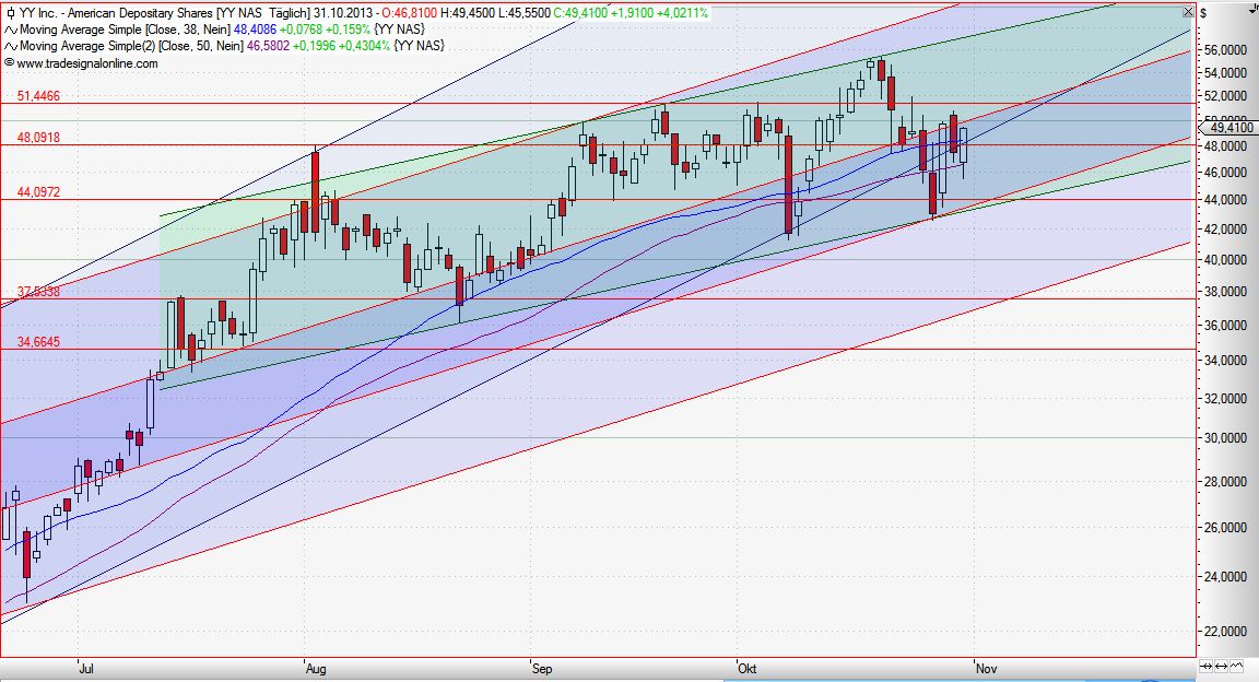 ...richtig interpretiere, sind der Umsatz um über 100% und der Gewinn gegenüber dem Vorjahr um über 200% gestiegen. Die verschiedenen Geschäftsfelder haben sich gut entwickelt und die Investitionen der Vergangenheit zahlen sich langsam aus. Für das Q4 wird eine Umsatzsteigerung um über 90% YOY erwartet. Ich denke das sind gute Zahlen, die ein stabiles Wachstum bei guter Profitabilität erwarten lassen und längerfristig Kurse jenseits der 60 $ rechtfertigen. Ich glaube man könnte YY Inc. auch langfristig halten und vor den Q4 rechne ich mit 65$ oder mehr, wenn uns der Gesamtmarkt keinen Strich durch die Rechnung macht. Wenn der Kurs durch Gewinnmitnahmen nochmal in Richtung 40 - 45 $ geht würde ich das als Gelegenheit zum Wiedereinstieg oder zum Aufstocken sehen. Nur meine Meinung, keine Kauf- oder Verkaufsempfehlung!