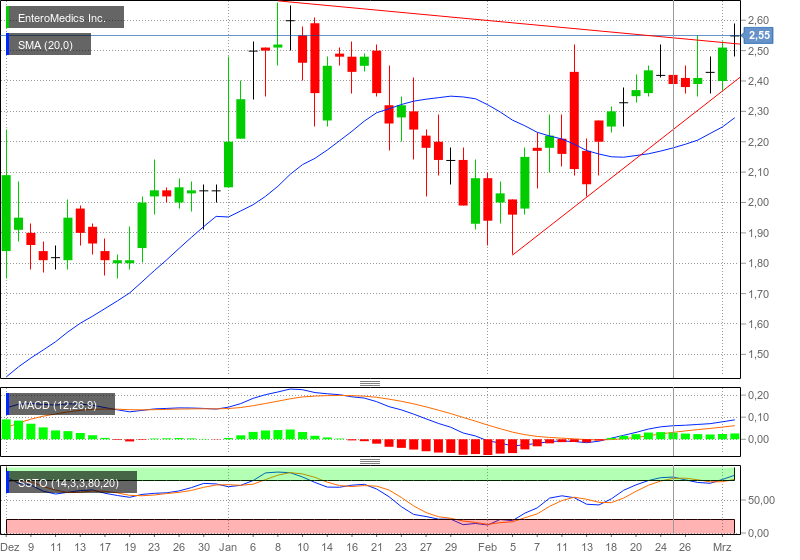und zwar haben wir hier einen aufsteigenden Keil, der so langsam seinen Schluss findet, und signalisiert, dass es hier noch weiter in Richtung Norden geht. Der Keil wurde schon verlassen (oben), diese Schwarze Kerze illustriert, einen neues Signal, und zwar wird sich heute wird das Kaufvolumen heute erhöhnen und weitere Signale liefern. SMA (20) und MACD unterstützen dies, ein weitere Signal liefert auch SSTO, heute kommt wieder Leben in die Bude! Dies ist keine Kauf- oder Verkaufsempfehlung, jeder muss für sich selbst entscheiden ob eine Aktie attraktiv für einen ist oder nicht!