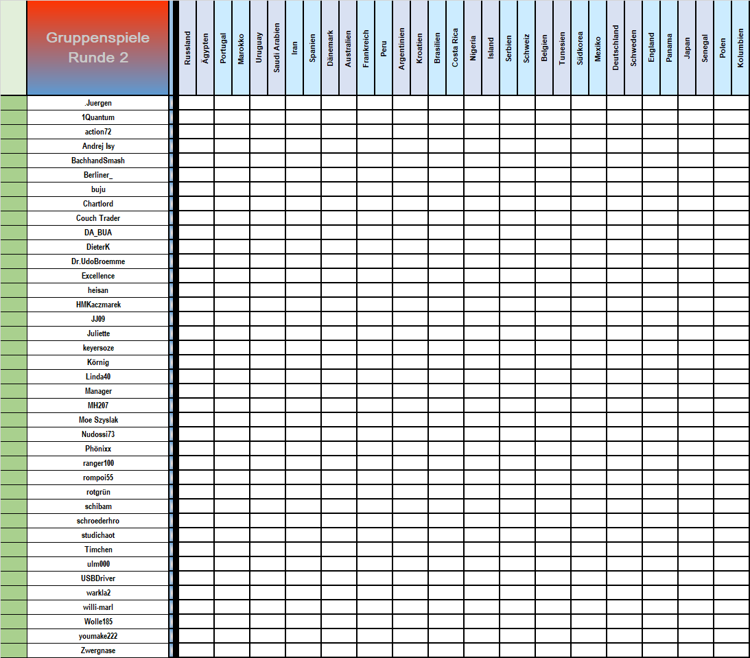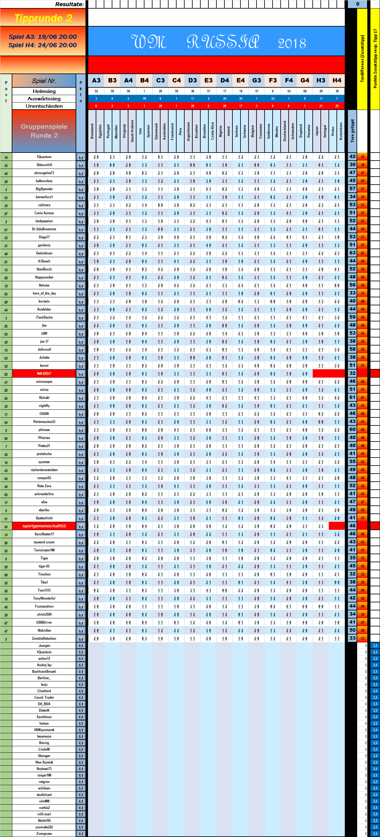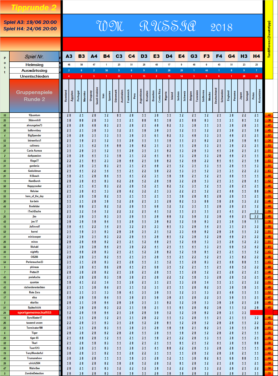 Achtung!rote Markierungen: Die Mitspieler MH207 und sportgemeinschaft53 haben keine vollständigen Tippscheine ausgefüllt. Diese können eizeln nachgereicht werden. Um von dem Zusatztipp (Tordifferenz) noch profitieren zu können, muss dies aber vor Spielrundenbeginn (also noch heute vor 20:00 Uhr) erfolgen.