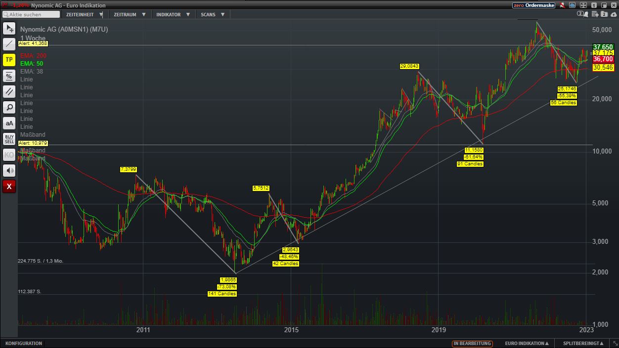 Solche Treffer sind natürlich selten. Meine Käufe 2010 und 11 lagen im Schnitt unter 4 EUR. In den Peak bei 55 habe ich um 50 die Hälfte verkauft, da ich etwas Kapital brauchte. Ich hab mal den langfristigen Wochenchart angehängt, der die immer wieder vorkommenden Abwärtstrends vom Zeitraum zeigt. Nach den Käufen 2010/11 lag ich über 50% hinten. Da die Richtung von Nynomic, damals noch m-u-t, stimmte, bin ich dabeigeblieben. Der damalige CEO war aber nicht so fähig, wie der aktuelle Vorstand. Seitdem die Herren Müller/Peters am Ruder sind läuft es besser. Stand heute sehe ich keinen Grund warum Nynomic nicht irgendwann bei 100 stehen sollte, außer dass die Firma vorher übernommen wird. Seit fast 10 Jahren (Juni 2013) dauert der Aufwärtstrend nun an. Um in 10 Jahren bei 100 zu stehen, muss die Aktie "nur" knapp 10% pro Jahr machen und damit nur leicht über der Marktrendite laufen.