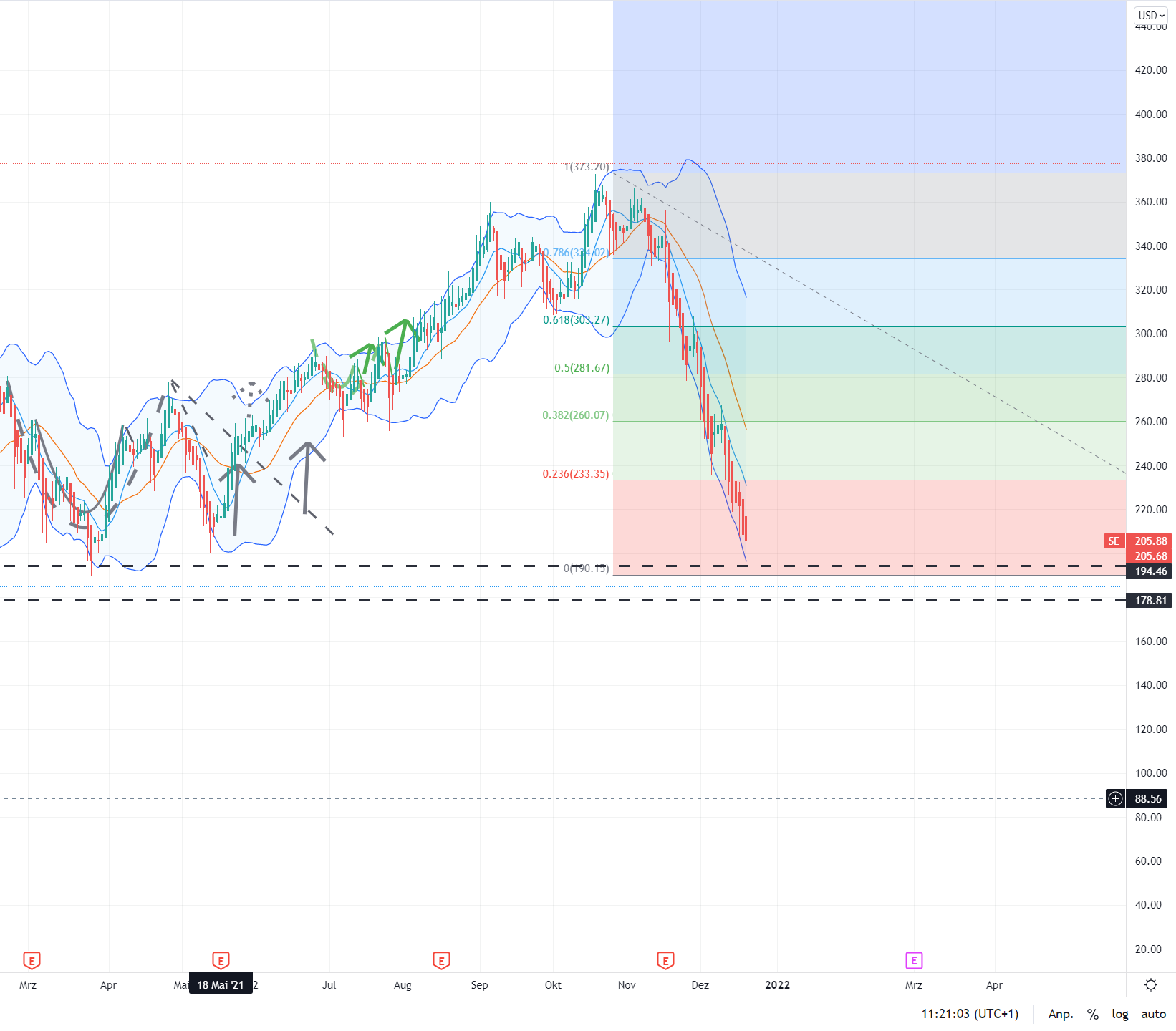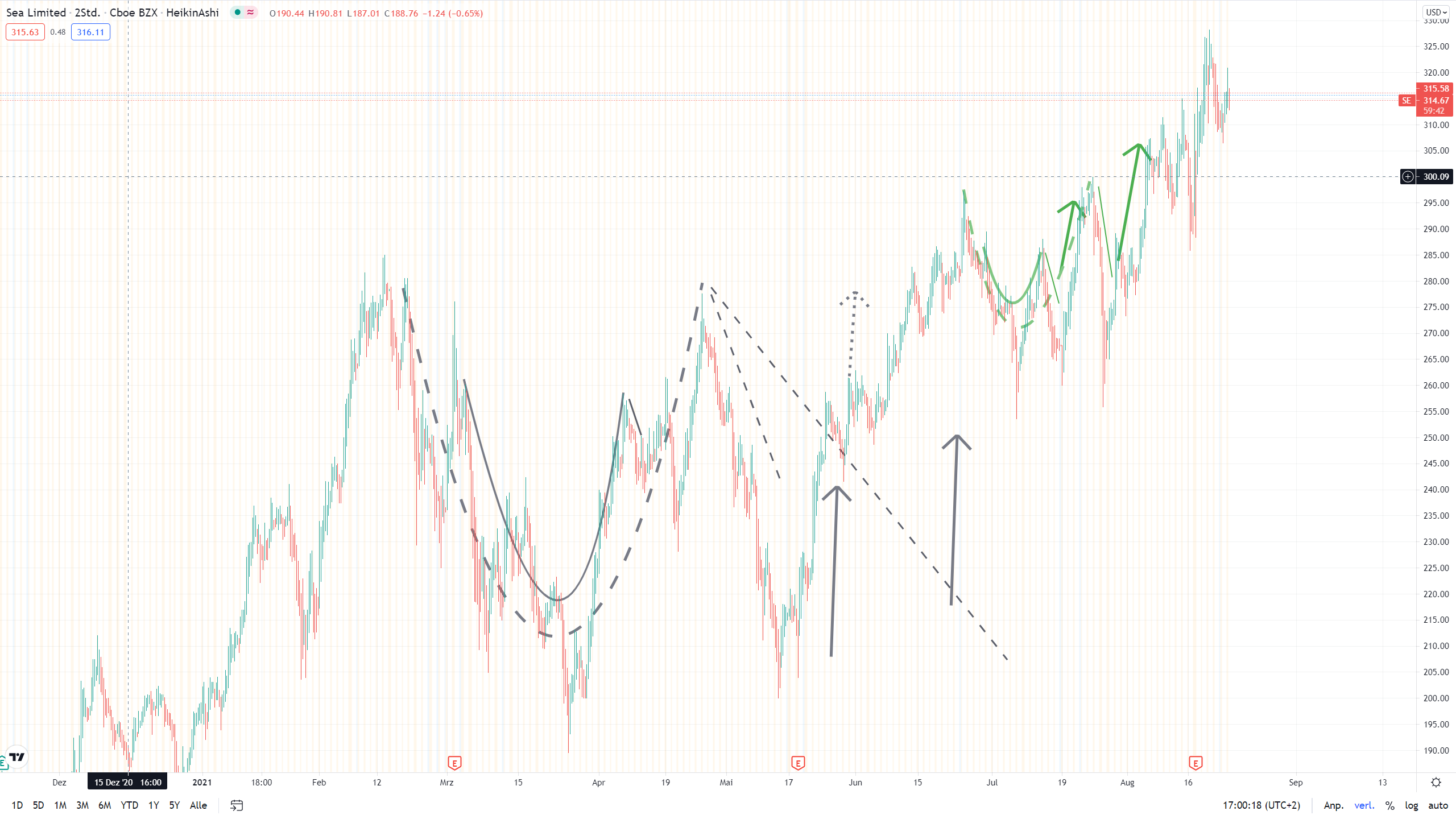 Ja, ganz genau das ist mein Schema bei der Top-Aktie von Sea Limited. Immerhin ist die Aktie gemessen in Euro bereits von 322 Euro auf 249 Euro eingebrochen. Das entspricht einer Korrektur von ca. 23 % innerhalb weniger Wochen.