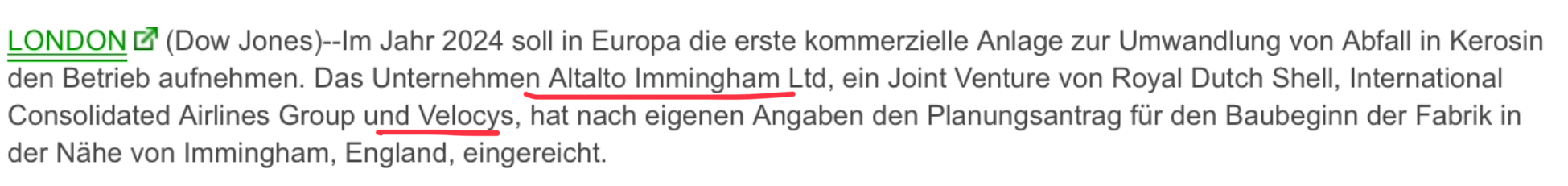 Was hier auch interessant ist, das Unternehmen Altalto baut die Anlage und wird diese auch betreiben. Altalto ist zusammen mit Royal Dutch ja auch von Velocys ein Tochterunternehmen. Also bleiben die Einnahmen aus dem Verkauf von dem Kraftstoff auch bei Velocys hängen.