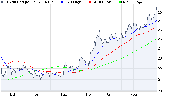 Deshalb habe ich mich entschlossen in den ersten Jahren, bis ich selbst ein Gold-Experte geworden bin, auf einen Goldminen-ETF zu setzen der a l l e großen Goldminen der Welt enthält !!! Die Wahl ist auf den ETFX DAXglobal Gold Mining Fund (A0Q8NC) gefallen, der zwar mit 0,65% Jahresgebühr nicht gerade billig ist, aber da er das Who is Who der weltweiten Goldminen enthält und alle großen Förderländer abdeckt auch die maximal mögliche Sicherheit bietet !!! Zum Einstieg habe ich 1000 € investiert und der Chart zeigt immerhin einen Rücksetzer, also diesmal n i c h t zum Höchstkurs gekauft !!!