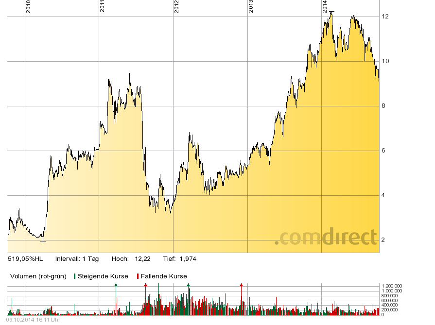danach kommt nur noch das Allzeittief bei 9,60. Dann wären wir allerdings bei einer MK von nur noch knapp 250 Mio., was ein unglaubliches KUV von 0,25 zur Folge hätte. Das KGV dürfte dann ebenfalls 2015 klar einstellig sein. Dafür würde ja dann schon ein Gewinn von nur 25 Mio. reichen.