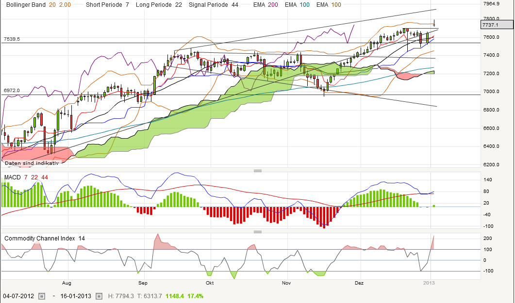 des deutschen Einkaufsmanagerindex. Sollte der schlecht ausfallen, sollte es unter 7700 gehen. Auf jeden Fall ist wieder Musik drin beim Traden.
