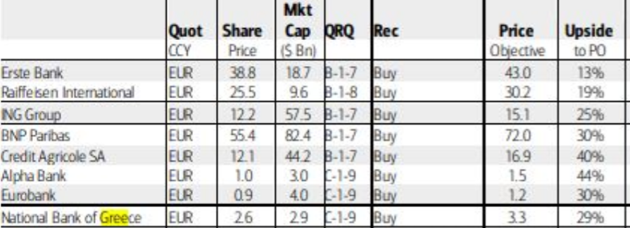Für die Eurobank gibt sie ein Kursziel von 1,2 Euro je Aktie an, für Alpha ein Kursziel von 1,5 Euro je Aktie, für die National Bank ein Kursziel von 3,3 Euro je Aktie und für die Piraeus Bank ein Kursziel von 1,4 Euro je Aktie.
