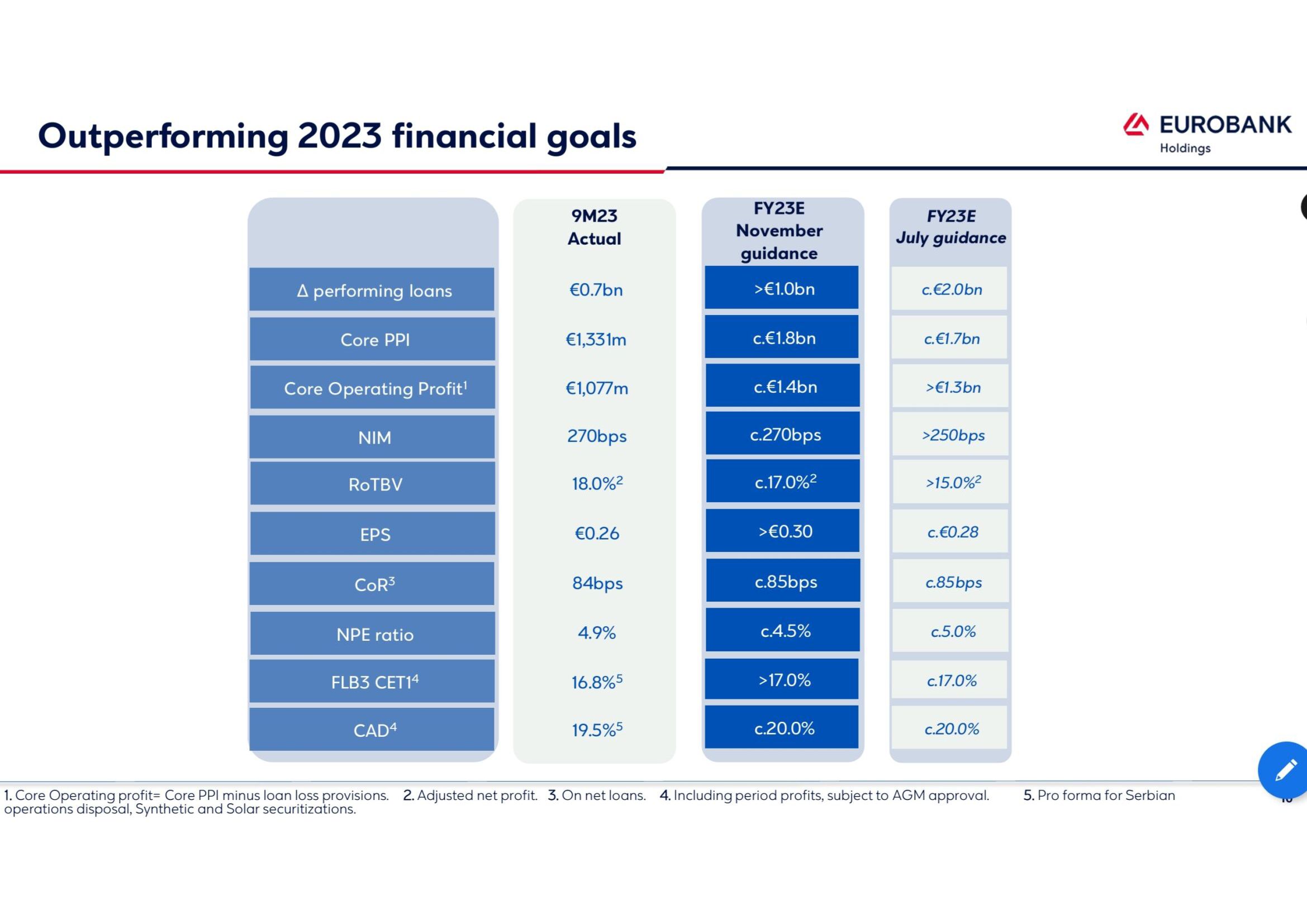 • Normalised Profit After Tax of €208.1mn in Q3 2023, is Reported Profit /(Loss) After Tax of €188mn excluding (a) Impairment losses of fixed assets and equity investments of €7mn, (b) Gains/(Losses) on disposal of fixed assets and equity investments of €7mn, (c) NPA transactions impact of €2mn, (d) €22mn on other adjustments and tax charge related to the above. ..."
