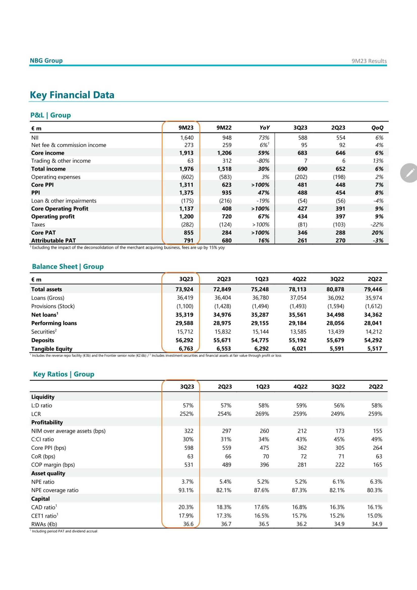 • Recurring OPEX 1.5% better q/q to €235.5mn on reduced G&As. 9M 2023 recurring OPEX flat3, despite inflationary pressures and investments, tracking in line with 2023 guidance. C/I down by 14pp vs 9M 2022. • Core PPI up by +18.4% q/q, on higher top line and improved fee performance. 9M 2023 Core PPI up +74.2%, driven by strong Core Banking Income increase (+34.4% y/y).