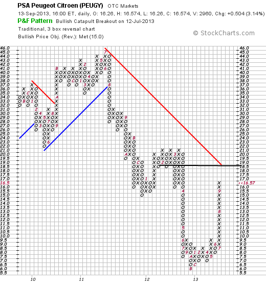 etwas anders. Peugeot wurde recht hart abgestraft. Zum Teil auch berechtigt. Ich kann mir nicht vorstellen, dass man Peugeot den Bach runter gehen läßt. Der Neue 308 ist jetzt zwar nicht so mein Fall, von seinem Erfolg bin ich dennoch überzeugt. gerade in den Peripheriestaaten verkauft sich Peugeot wieder stärker. Dass in Frankreich die Zahlen rückläufig sind, erachte ich als nebensächlich, da ich dies als kurzfristige Sache sehe. Als langjährigen Schnitt kann man bei Peugeot von € 20.- bis € 25.- ausgehen. Hier liegt für mich der stimmige Kurs. Klar bleibt es volatil und auch meine Nerven werden auf die Probe gestellt. Dennoch ich bin überzeugt und bleibe dabei.