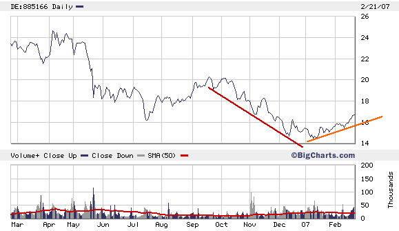 Rückblick: Die HYUNDAI MOTORS Aktie startete nach einem Tief bei 0,97 Euro im Oktober 1998 zu einer langfristigen Aufwärtsbewegung. Im Mai 2007 brach die Aktie dann über eine wichtige Pullbacklinie auf einem Niveau von 12,50 Euro nach oben aus. Bis Januar 2006 kletterte die Aktie auf ein Hoch bei 29,50 Euro. Von dort aus setzte eine massive Abwärtskorrektur ein. In der Endphase dieser Korrektur kam es im April 2007 zu einer bärischen Übertreibung. Denn die Aktie fiel kurzzeitig unter den zentralen Unterstützungsbereich um 13,27 Euro und markierte ein Tief bei 12,45 Euro. Seitdem zieht die Aktie wieder deutlich an. Den Abwärtstrend seit Januar 2006 hat sie bereits gebrochen.
