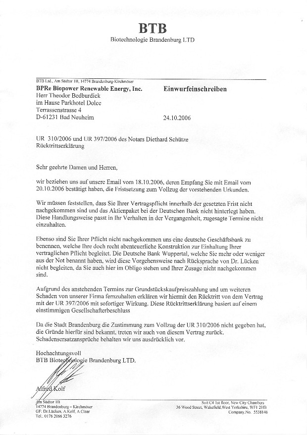 Diese BTB Ltd für 1Pund Gründungskapital ist Ihrer sache und Pflichten nicht nachgekommen, da hat die GIB einen Fehler gemacht, na gut fehler passieren, das dann die BTB Ltd. die frechheit besitzt noch ein kündigungsschreiben aufzusetzen um von ihren fehlern auf die GIB bzw. BPRE alles abzuwälzen ist eine Bodenlose Frechheit.