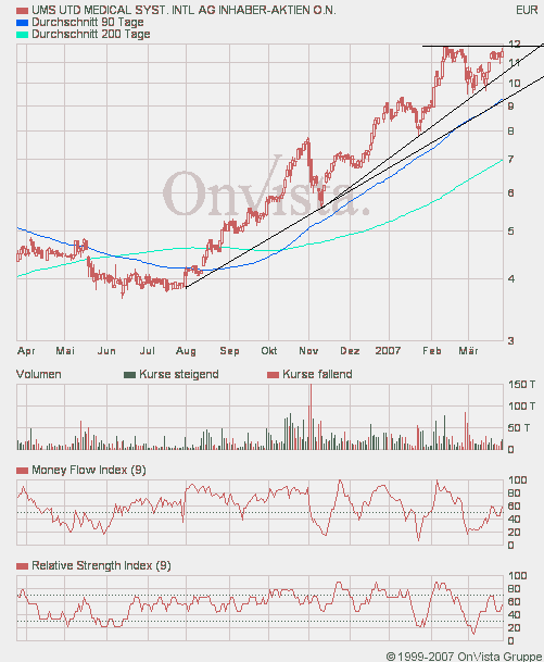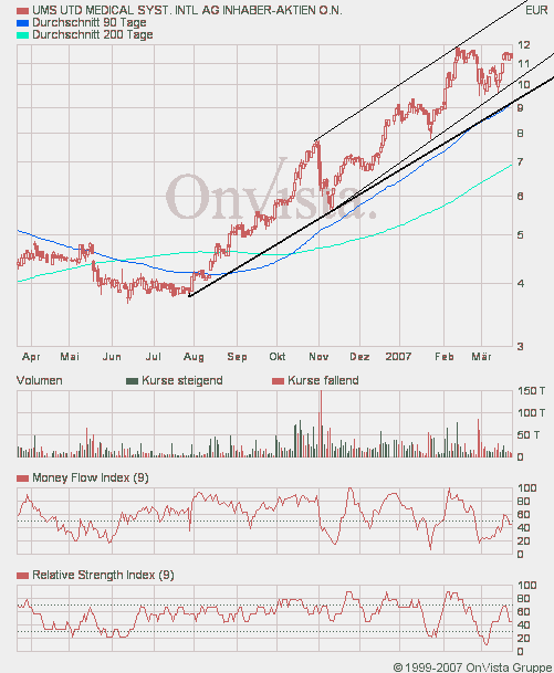 Detmold (aktiencheck.de AG) - Die Experten vom "Frankfurter Börsenbrief" empfehlen die Aktie von UMS (ISIN DE0005493654/ WKN 549365) mit Stop-buy-Limit von 12,05 EUR zu ordern. UMS glänze mit guter relativer Stärke und einem sehr interessanten wie simplen Geschäftsmodell. Man sei weltweit auf den transmobilen Einsatz von Medizintechnik-Systemen spezialisiert und biete Full-Service-Leistungen für Kliniken und Fachärzte. Damit sei es den Kunden (Kliniken und Ärzte) möglich, bei Diagnose-Behandlung von Patienten auf neueste Medizintechnologie zurückzugreifen, ohne selbst erhebliche Mittel in feste stationäre Einrichtungen binden zu müssen. Stattdessen könne man sich dies von UMS sozusagen "leihen". Für die Patienten biete sich der Vorteil, dass man mit moderner Technologie im Zweifelsfall besser untersucht bzw. behandelt werde. Typische Geschäftsfelder von UMS seien Urologie, Radiologie und Gynäkologie. Das Unternehmen habe sich von einigen operativen Verlustbringern getrennt und stehe nun aussichtsreich aufgestellt da. Man beschäftige 190 Mitarbeiter und habe etwa 1.000 Kunden weltweit. Das erlaube noch eine Menge Wachstum in den kommenden Jahren. In den ersten 9 Monate 2006 habe der Umsatz um 21% auf 27,5 Mio. EUR gesteigert werden können. Der Konzernüberschuss habe um 38% auf 5,8 Mio. EUR zugelegt. Die EBIT-Marge liege bei ansehnlichen 31%. Per 30.09. habe die Eigenkapitalquote bei ca. 40% gelegen. Dagegen stehe ein KGV von etwa 14,7. Das sei nicht sensationell niedrig, aber auf längere Sicht gleichwohl eine Basis. Die Experten vom "Frankfurter Börsenbrief" haben die Aktie von UMS bereits in ihr 3sat-Musterdepot aufgenommen und raten mit Stop-buy-Limit von 12,05 EUR zu ordern. Das Kursziel sehe man bei 15 EUR. Das Stop-loss-Limit sollte bei 10,70 EUR gesetzt werden. (26.03.2007/ac/a/nw)