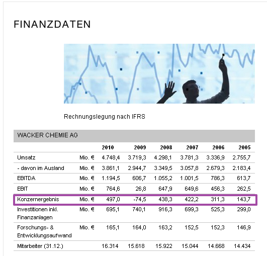 Der Umsatz werde nun 2011 wie im Vorjahr rund fünf Milliarden Euro betragen, das Betriebsergebnis (Ebitda) wie 2010 bei rund 1,19 Milliarden liegen, teilte Wacker mit. Sorge macht neben den zusätzlichen Belastungen durch hohe Rohstoffkosten auch die Nachfrageflaute der Solar- und Halbleiterindustrie.