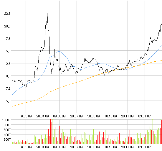 Bei der Nordex-Aktie kommen zur Übernahme-Fantasie auch noch positive Chart-Aspekte hinzu. Mit dem Sprung über 19,60 Euro hat der TecDAX-Wert einen kurzfristigen Aufwärtstrend-Kanal nach oben durchbrochen und dürfte nun die alten Vorjahreshöhen von Mai bei 23 Euro (siehe Chart-Vergrößerung oben) anstreben. Darüber hinaus winken längerfristig Kurse um 45 Euro, wo die Nordex-Aktie im September 2002 ein Zwischenhoch markierte.