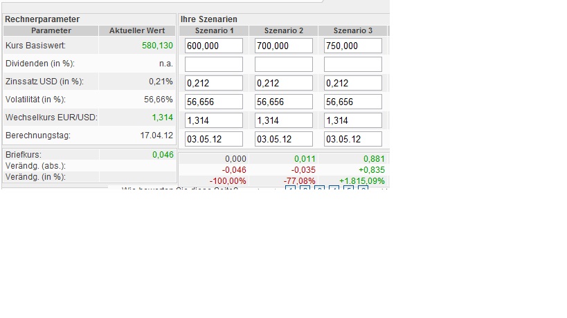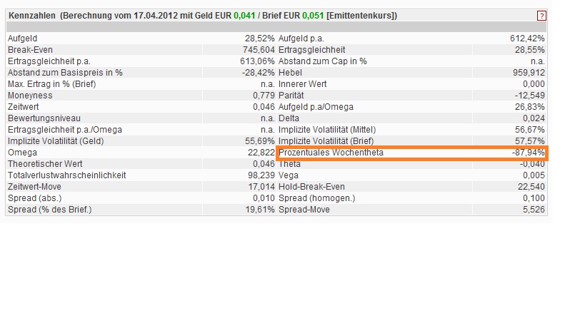 bei dem von euch ausgesuchten schein ist die vola sehr hoch - <55% -> das kann fast nix mehr werden. wenn dann nur für extrem kurzzeitiges zocken zu gebrauchen. ich würd sowas nicht länger als nen tag halten bzw. besser gar nicht kaufen wg. dem hohen spread.
