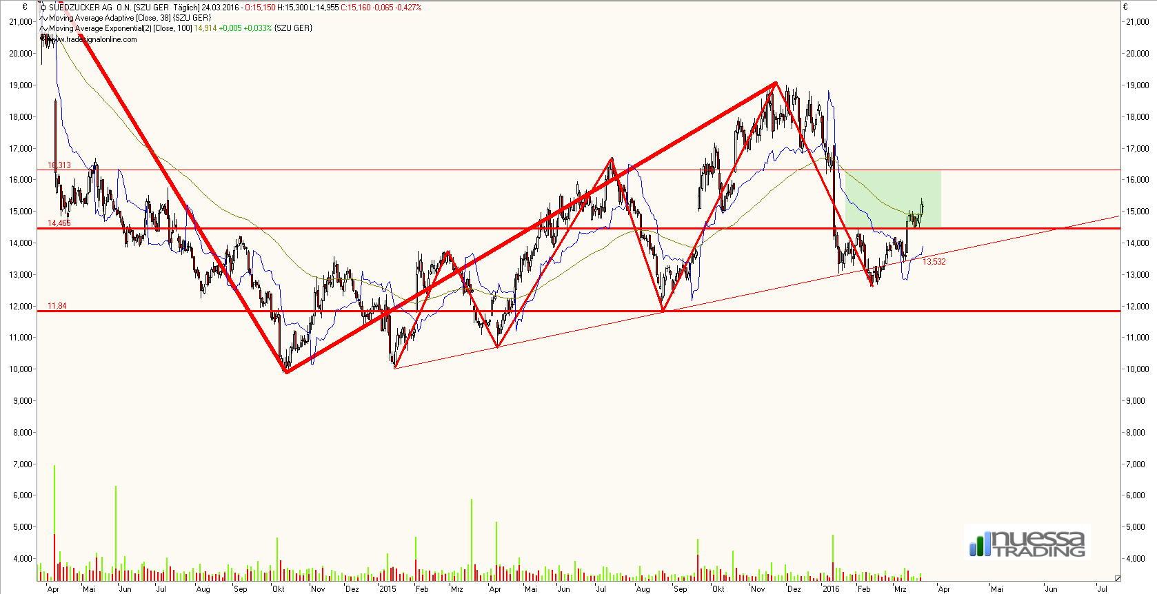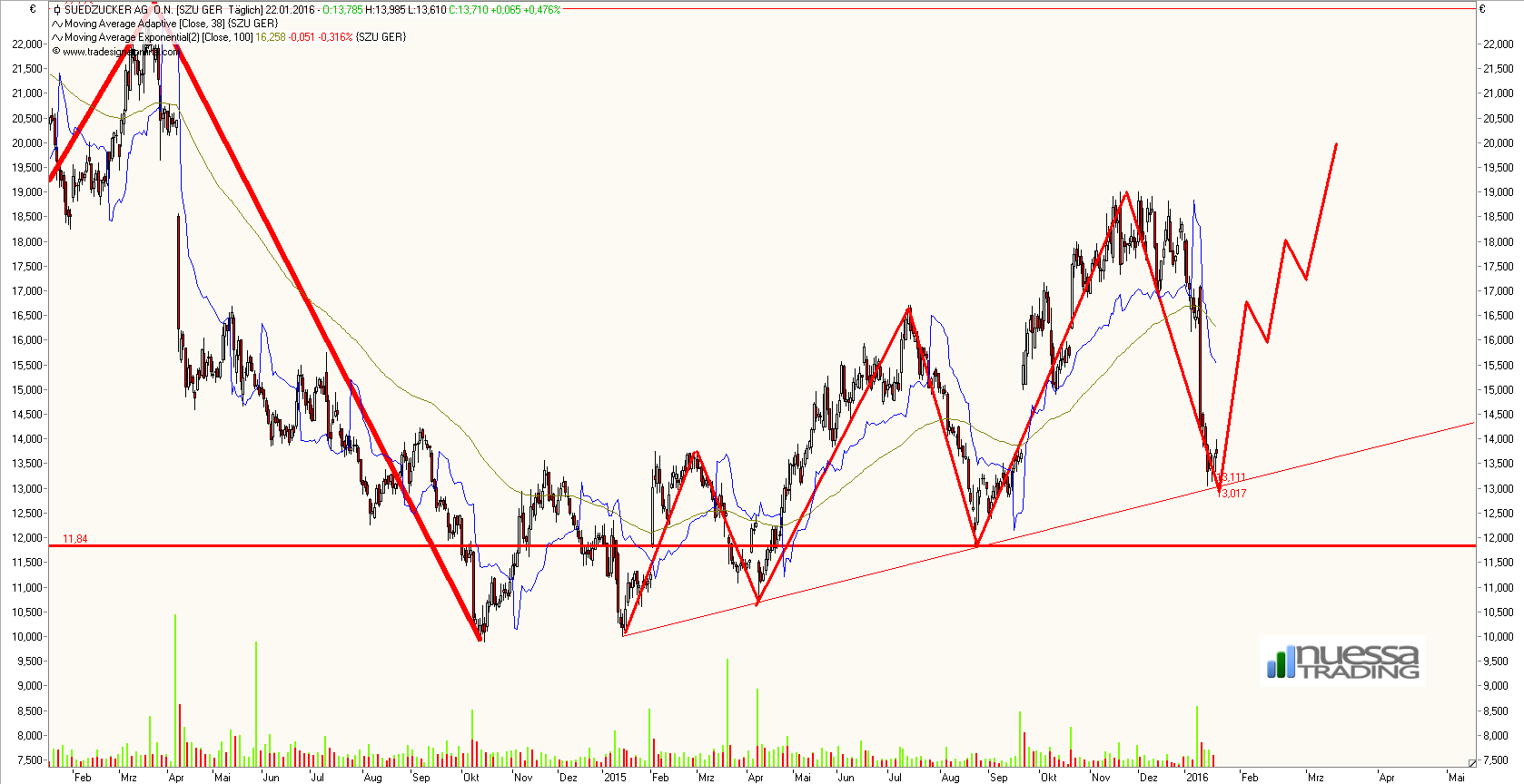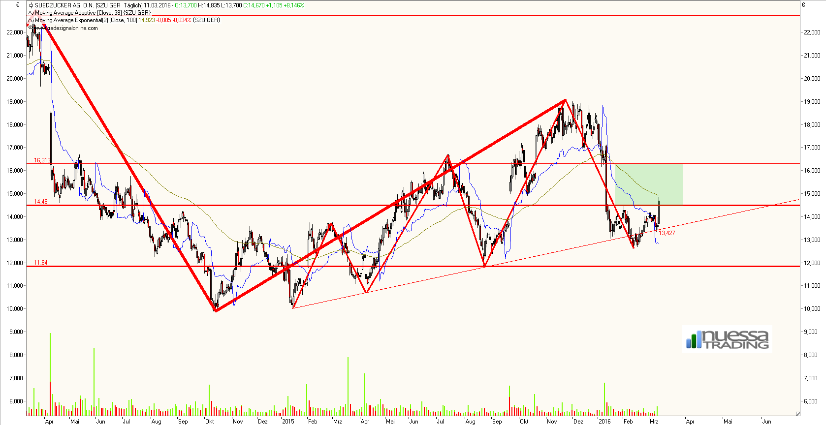 Die Aktie der Südzucker AG konnte gestern mit einer beeindruckenden Kerze den Abwärtstrend seit dem Hoch um 19 € brechen. Damit eröffnet sich die Aktie weiteres Potenzial bis zunächst ca. 16,30 €. Dieses Ziel ist aktiv solange kein neues Tief mehr generiert wird dies wäre bei einem Schlusskurs unter 12,60 € der Fall.