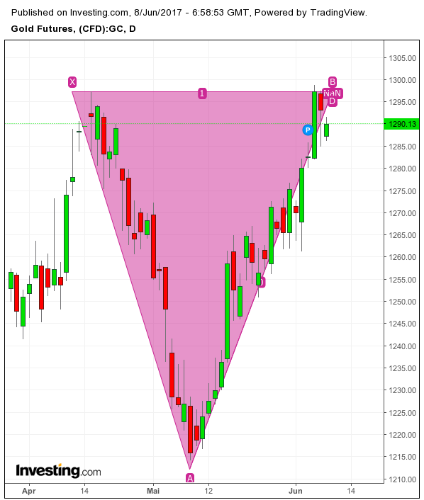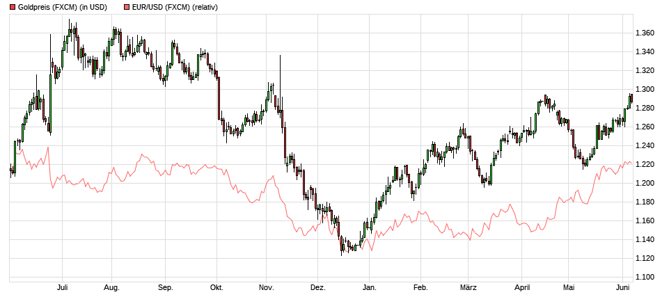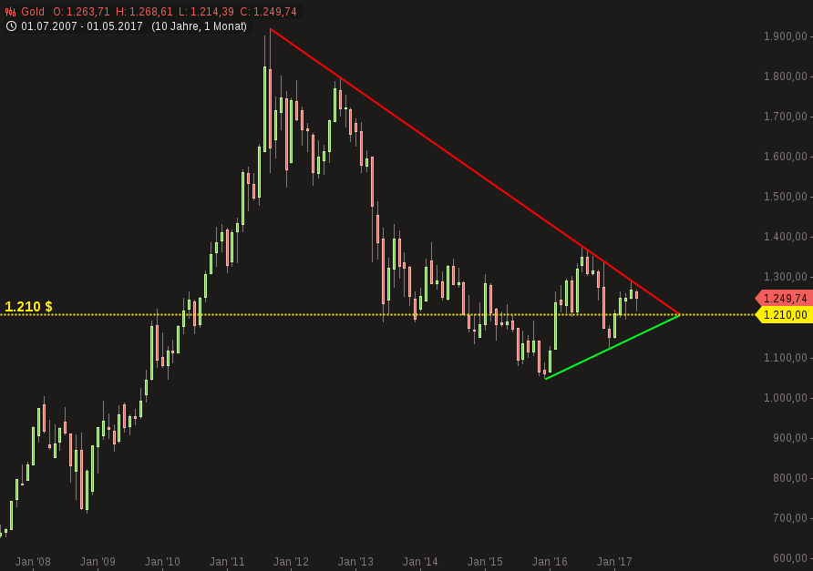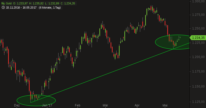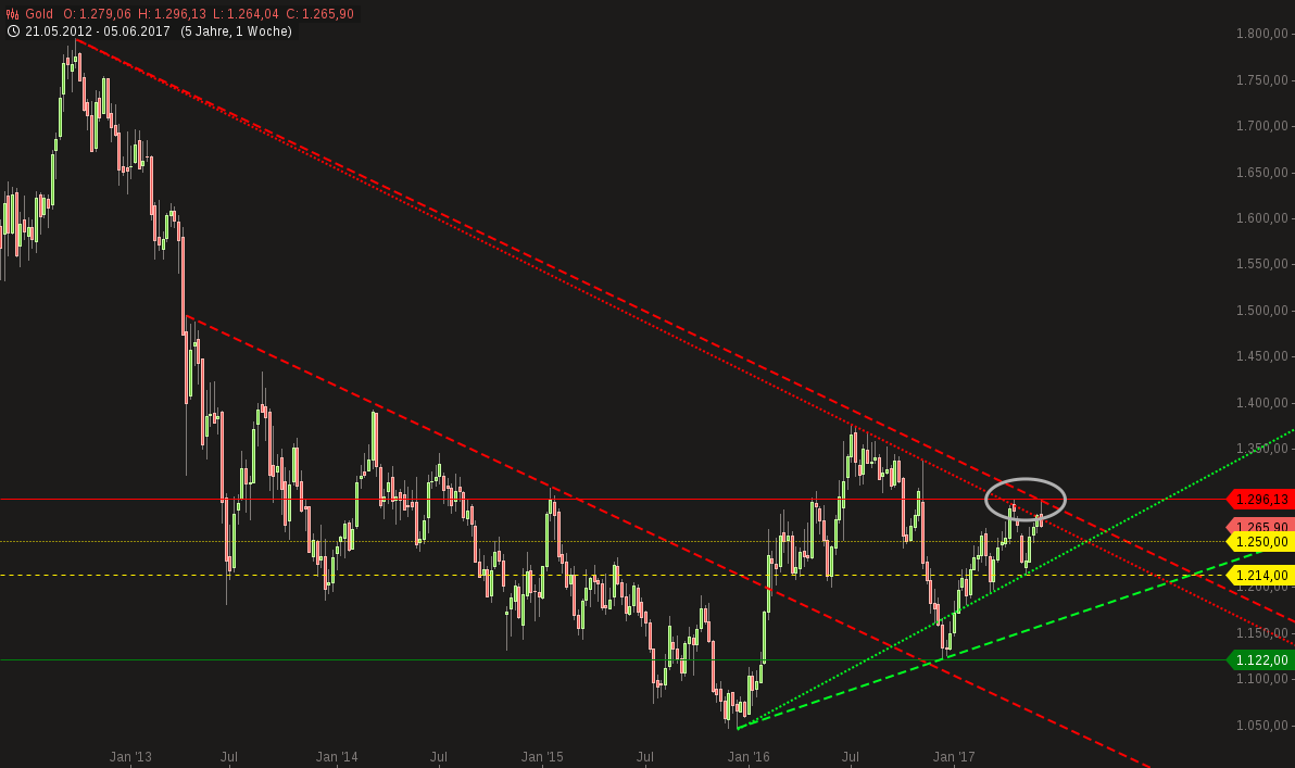Zwischen den beiden jüngsten, Widerstand bildenden Hochs vom 18. April 2017, 1.292,37 $ und 06. Juni 2017, 1.296,13 $ liegen knapp zwei Monate.