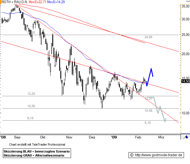 Rückblick: Stück für Stück konnten die Käufer in den vergangenen Wochen diverse bärische Faktoren in den Aktien von Roth + Rau nach oben aushebeln. So gelang Ende Januar der Ausbruch über die seit September 2008 federführende Abwärtstrendlinie. Auch die ältere Trendkanalunterkante konnte wieder zurückerobert werden und parallel dazu gelang gestern der Ausbruch über die exp. GDL 50 sowie den horizontalen Widerstand bei 14,39 Euro per Tagesschluss.