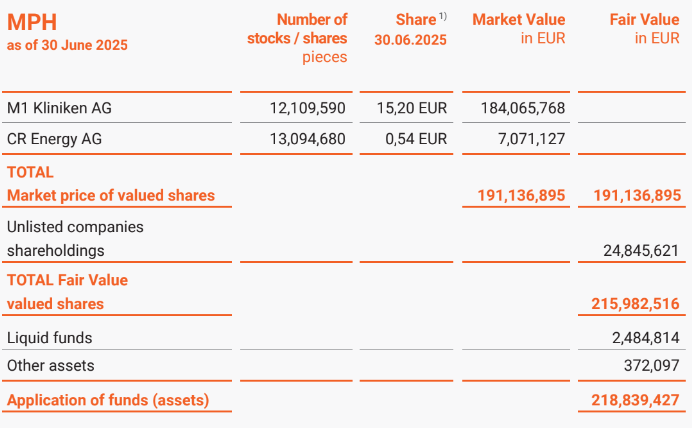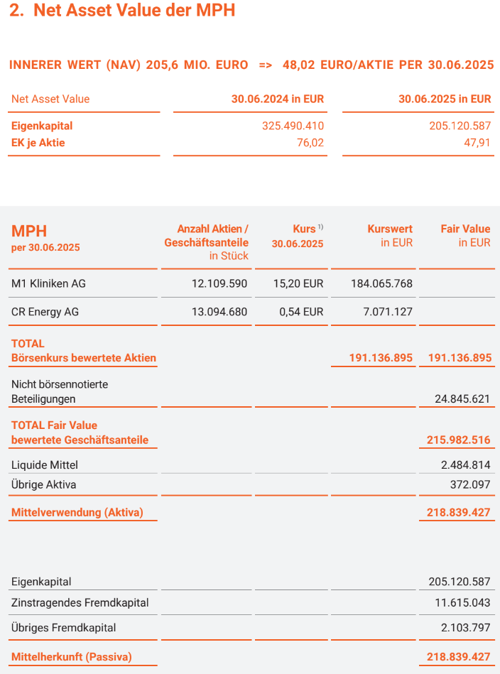 12.109.590 M1-Aktien (30.06.2025) x €14,08 M1-Kurs (19.09.2025) / 4.281.384 MPH-Aktienzahl = €39,82