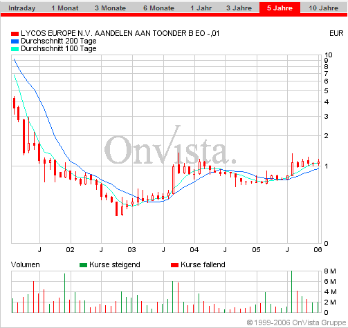 diesen hohen Tages-Schlußkurs haben wir während der Zwischen-Hochs 2003 und 2004 nicht gesehen, d.h. ein so hoher Tages-Schlußkurs ist für Lycos Europe inzwischen über 4 Jahre her