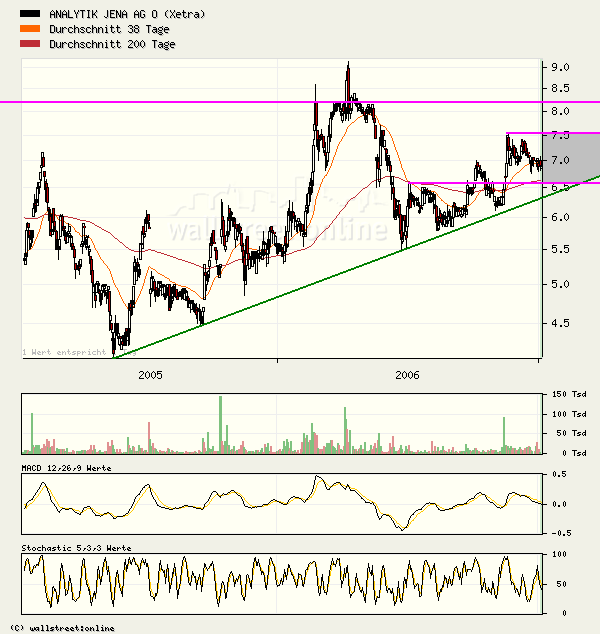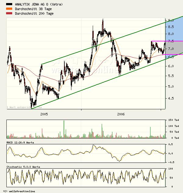 ###Ausblick: Kurzfristig sollte die ANALYTIK JENA Aktie bis ca. 8,38 Euro anziehen. Bricht die Aktie dann dieses Mal über den Widerstand aus, kommt es zu einem langfristigen Kaufsignal mit Zielen bei 11,30 und später 21,57 Euro. Es kann allerdings durchaus zu einem kurzen pendeln um die Marke kommen. Prallt die Aktie aber an diesem Widerstand ab, wären Abgaben bis an den langfristigen Aufwärtstrend seit 2003 bei aktuell 6,65 Euro zu erwarten.###