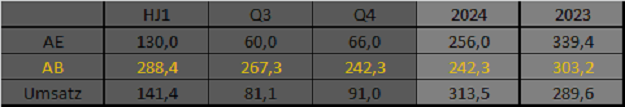 Ich geh mal von folgemdem Szenario aus, also dann knapp 20% sinkendem Auftragsbestand. Ob das dann auch zu 20% Umsatzrückgang in 2025 führen wird (würde etwa 55-60% Gewinnrückgang bedeuten), wird davon abhängen, ob sich die Lage in der Branche im 1.Halbjahr 2025 bessert.