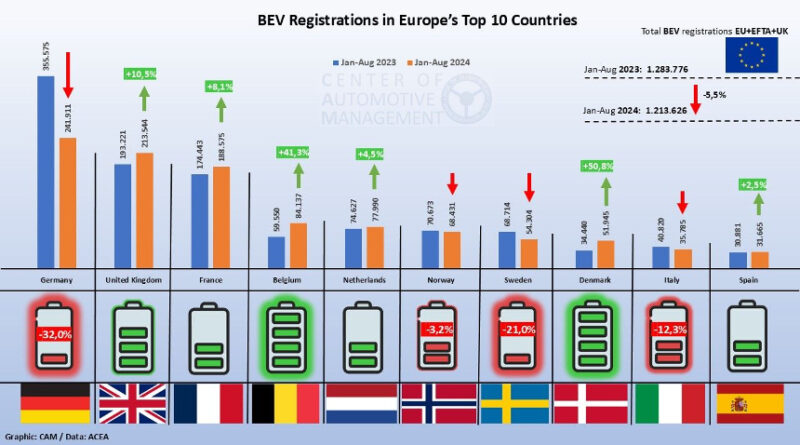 „From January 1 through August 31, 2024, a total of 1,213,262 new EV sales were recorded in Europe, according to CAM Director Stefan Bratzel. In the same period in 2023, there were 1,283,776 new electric cars. CAM collects data on the EU states and the four EFTA countries — Iceland, Liechtenstein, Norway, and Switzerland. That is important because the EFTA markets are included in the calculation of the manufacturers’ carbon dioxide fleet limits. The situation is different for the UK, which has its own CO2 regulation since leaving the EU.