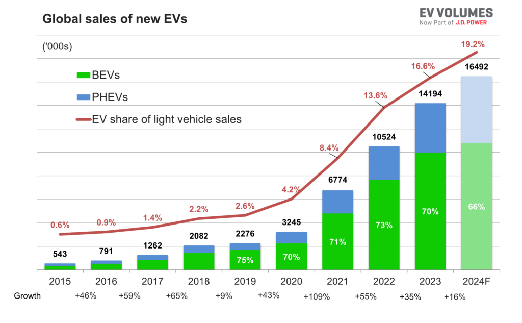 Weltweit befindet sich der E-Automarkt weiter im Wachstum, wenn auch ein wenig abgeschwächt. EV volumes geht für 2024 mittlerweile nur noch von rd. 16,5 Mio aus, ein voraussichtlicher Zuwachs von 16 %.