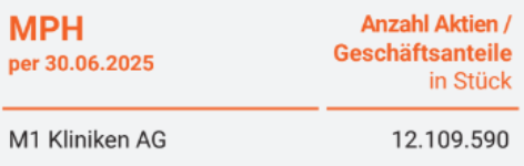 12.109.590 M1 Kliniken-Aktien (30.06.2025) x M1-Aktienkurs €15,88 (31.10.2025) / 4.281.384 MPH-Aktienzahl = €44,91
