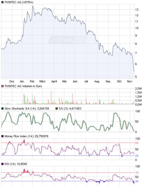 Für das laufende Geschäftsjahr rechnet SES Research mit einem Umsatz in Höhe von 72,5 Millionen Euro, für 2011 gar mit runden 100 Millionen Euro. Das Ergebnis sollte sich dann entsprechend überproportional dazu entwickeln. Der Gewinn soll in diesem Jahr auf 6 Millionen und im kommenden auf über 10 Millionen Euro steigen. Das Kurspotenzial gab SES Research mit ca. 17,- Euro je Aktie an. Auch das Anlegermagazin DER Aktionär hatte sich bereits im April positiv zu diesem Wert geäußert und eine klare 50 Prozent Chance ausgemacht. Leider schlug die Twintec Aktie kurz darauf die Gegenrichtung ein. Auf dem aktuellen Niveau dürfte die Aktie nun mit einem geschätzten KGV von unter 5 extrem günstig sein.
