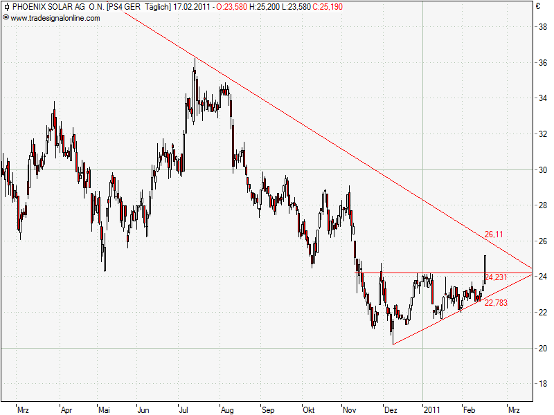 Jedoch hat die Gesamtmarktkorrektur einem weiteren Anstieg einen Strich durch die Rechnung gemacht und auch Phoenix Solar korrigierte letztendlich auf 22,50 Euro.
