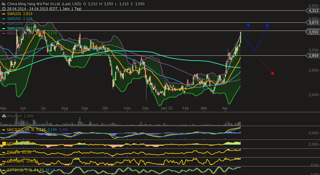 Die Q1-Zahlen von Goldwind lassen erhoffen/erahnen, dass Ming Yang ebenfalls super Q1-Zahlen hinlegen wird. Mal ganz abgesehen davon, dass Ming Yang einfach sehr günstig bewertet ist mit einem 2015er KGV von 7 (EPS 2015 von mir geschätzt: 0,50 $ - Guidance Ming Yang bei 0,47 $). Da Ming Yang keine Nettofinanzverschuldung ausweist und stattdessen einen Nettocash von 100 Mio. $ ausweist liegt das cashbereingte 2015er KGV bei lediglich 5,5. Eine Jinko Solar z.B. hat ein cashbereinigtes KGV von 17 und Trina Solar sogar von über 20. Diese fundamentale Unterbewertung von Ming Yang ist meiner Ansicht nach schon richtig krass trotz der wunderschönen Kursperformance in den letzten 4 Wochen. Mal ganz abgesehen davon, dass der Auftragsbestand von Ende 2014 mit 3,7 GW einen Umsatz von 1,9 Mrd. $ entspricht und alleine mit diesem Auftragsbestand wäre Ming Yang fast 1 1/2 Jahre ausgelastet.