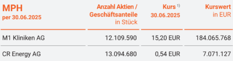 MpH-NAV je MPH-Aktie = 12.109.590 M1 Kliniken-Aktien (30.06.2025) x M1 Kliniken-Aktienkurs €15,15 / MPH-Aktienzahl 4.281.384 = €42,85