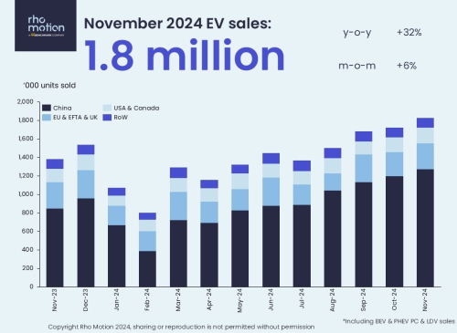 YTD per Ende November wieder ein deutliches Wachstum mit rd 32 % ggü. Vorjahr. Und in 2025 wird das Wachstum weitergehen.. Persönlich rechne ich mit mindestens 20 Mio. BEVs/PHEVs. Diesmal dürfte auch Deutschland und damit die EU zum Wachstum beitragen (Stichworte: CO2 Flottengrenzwerte, sinkende Preise bei E-Autos als auch deutlich gesunkene Akku-Kosten).