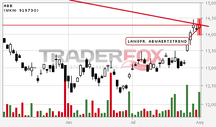 Die Aktie von ABB sollte kurzfristig auf 23,18 und später auf 24.08 CHF ansteigen. Ein Rücksetzer in den Bereich 22,06 - 21,95 CHF wäre noch einmal eine Einstiegschance. Ob es allerdings zu einem solchen Rücksetzer kommt es fraglich. Sollte die Aktie sogar unter 21,95 CHF abfallen, droht eine erneute Verkaufswelle in Richtung des Aufwärtstrends sei Juli 2010, was zu Kursverlusten bis 20,60 CHF führen könnte.