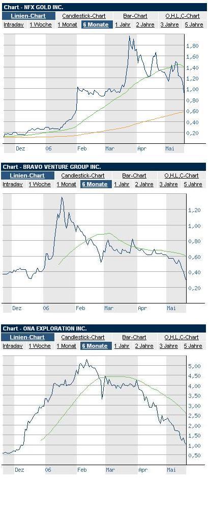 Am 15. & 16.05.06 habe ich 1/3 meines Depots mit guten Gewinnen, insbesondere durch Nordex, verkauft und habe nun erheblich trockenes Pulver. Noch habe ich einige Papiere mit positiven Vorzeichen, wie Sino, Kali & Salz, Postbank, Post, Douglas, Schoeller & Bleckmann, Bijou Brigitte, GCI, Pixelpark um einige zu nennen, bei denen die Spekulationsfrist von 1 Jahr nochnicht abgelaufen ist. Aber auch negative wie Fluxx, Catalis, VEM, Reinecke & Pohl liegen noch auf der Lauer für einen Sprung nach Norden.